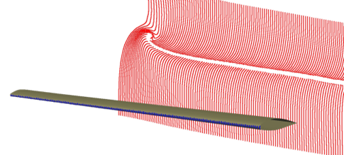 The first stage of the analysis process is to perform a Lagrangian particle analysis with a coarse distribution of points. This is currently limited to 1000 points by 1000points (y- and z-directions, assuming flow along the x-direction) and each analysis bin is run as a single job (‘job’ here referring to a task being submitted to a queue system on a computer cluster). This stage of the process is primarily aimed at defining the impingement limits and on minimising the number of particles that needs to be released during subsequent phases. Example results from a coarse analysis are shown below, with red points being ‘miss’ trajectories and blue points being those which have impacted the surface