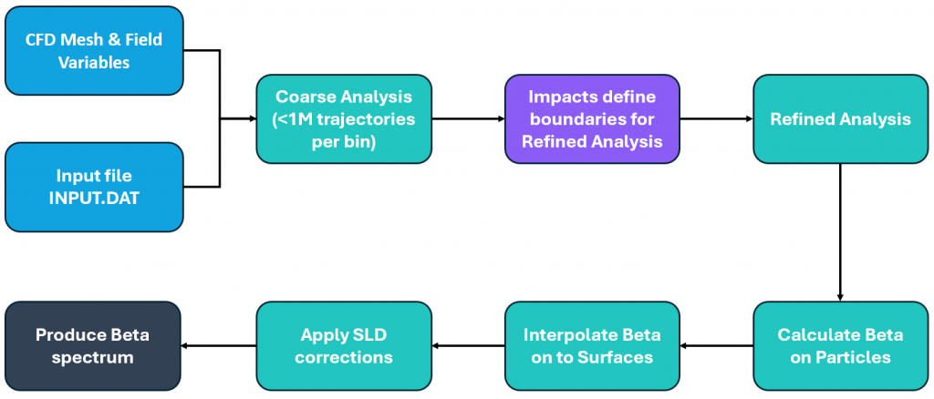 The general anaylsis process is shown below. The process begins with inputs of the CFD mesh and field variables (velocity), and a specific input file which defines the analysis conditions (e.g. droplet size/spectrum, droplet spacing in the freestream, surfaces upon which droplet impacts should be calculated).